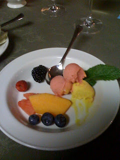 Finally, we ended the evening with a dessert course from a local place that makes their own dairy products, and our selections for the evening included raspberry and cantelope sorbets. I'm not that big on sorbet usually, but these were so sweet and creamy and tasted just like the fruits they had in them. I never would have considered making sorbet out of melons, but the cantelope one was just delightful. Served with a plate of fresh fruit on the side, including red raspberries, blueberries, some of the biggest and plumpest blackberries I've ever seen, watermelon, and cantelope, it was the perfect combination making a light dessert that ended a summer dinner nicely. We were served a sweet dessert wine called Late Harvest with dessert, which I'd say was just ok, but I'm not really big on the super sweet wines, so I'm not a great judge of that one.